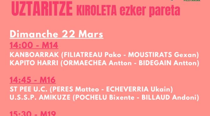 Dimanche 22 mars Joko garbi Finales Uztaritz mur à gauche Kiroleta – Martxoak 22, igandea Joko garbi finalak pilotariak Uztaritze Kiroleta ezker pareta